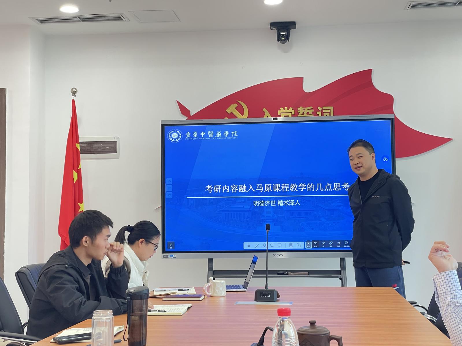 拓宽教学视野,打造思政金课。为加强思想政治理论课应用性,提升思政课吸引力,文晓鹏老师分享了“考研政治融入思政课的几点思考”。一是推荐优质考研政治资料,分享畅销书目;二是探索考研内容融入思政课的方法,拎清主次关系,平衡课程主体与考研真题的融入比例;三是把握整体难度,通俗讲解重难点,为理科学生搭建思政学习桥梁。
