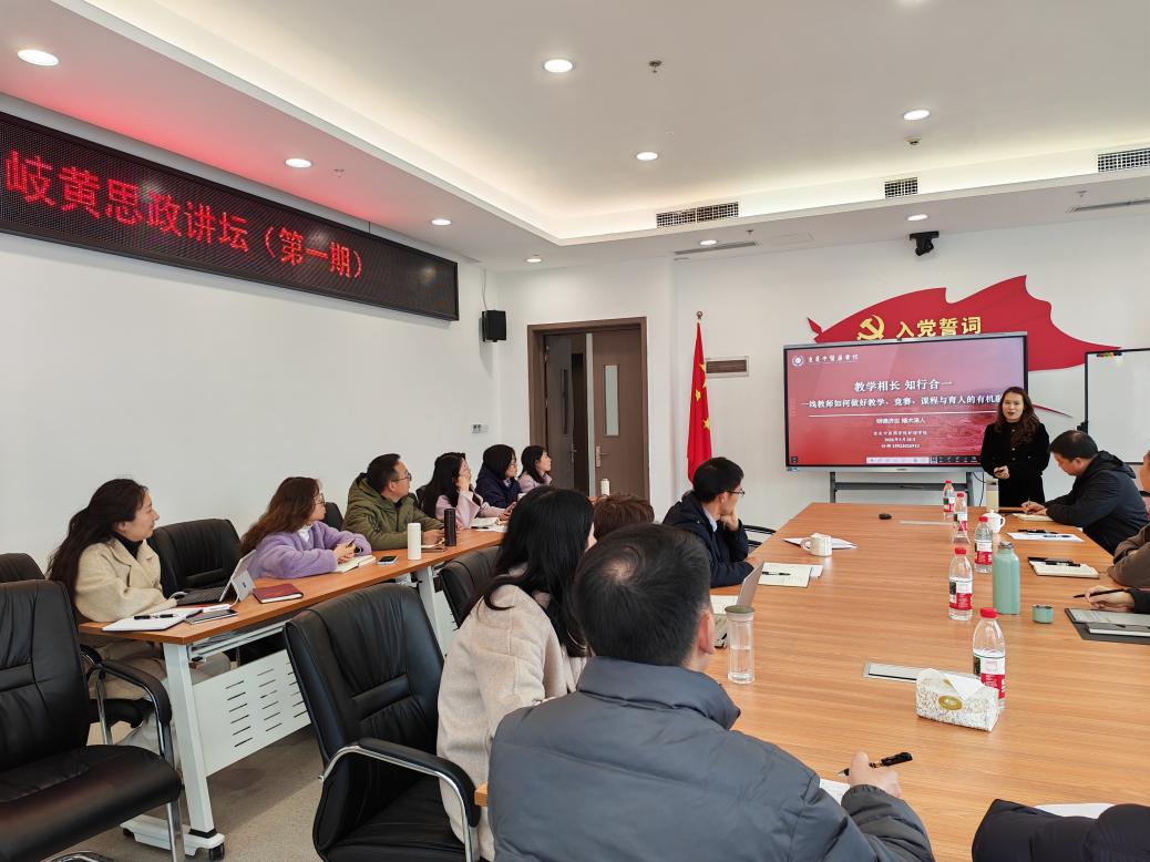 3月18日,马克思主义学院首期“岐黄思政讲坛”正式开讲。本次讲坛以“结合中医药文化推动思政课改革,建设高质量马克思主义学院”为主题,旨在深化思政课改革创新,探索中医药文化与思政教育的深度融合路径。学校党委宣传部部长唐彤东、江麗老师,护理学院任柳副教授受邀出席,马克思主义学院全体教师参加了本次活动。