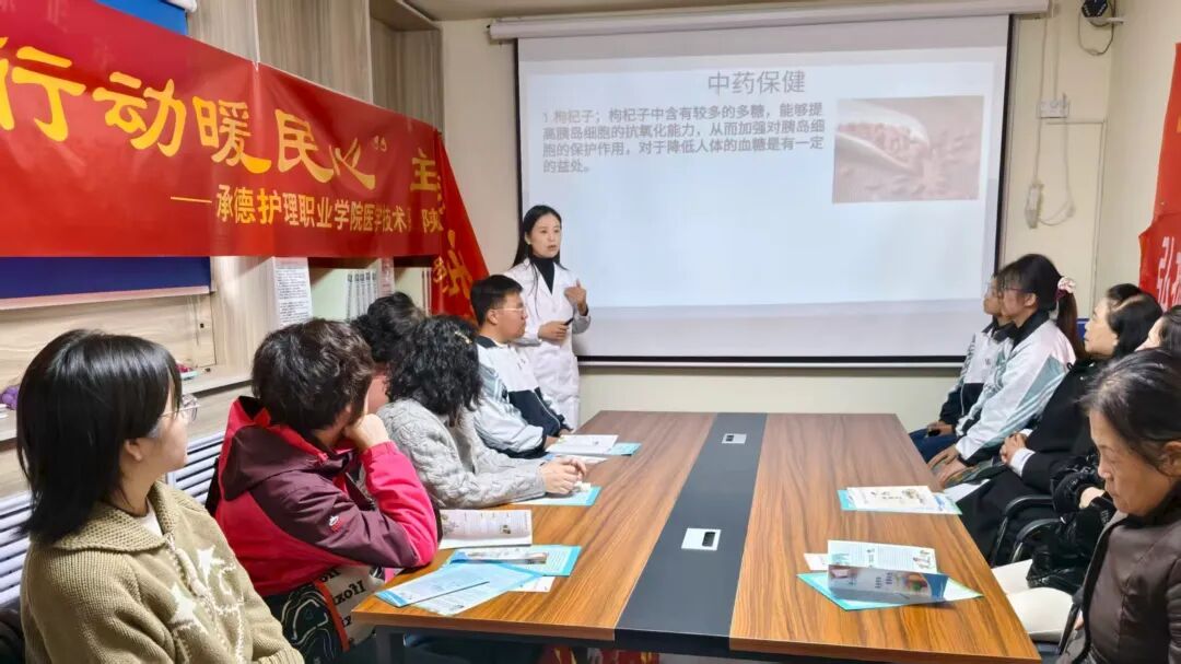 为弘扬中医药文化,提升居民慢性病自我管理能力,推广科学健康生活方式,2025年10月29日下午,学院中医药文化社团组织志愿者走进双桥区陕西营社区新时代文明实践中心,开展“慢病管理与降压操”主题科普宣传活动。