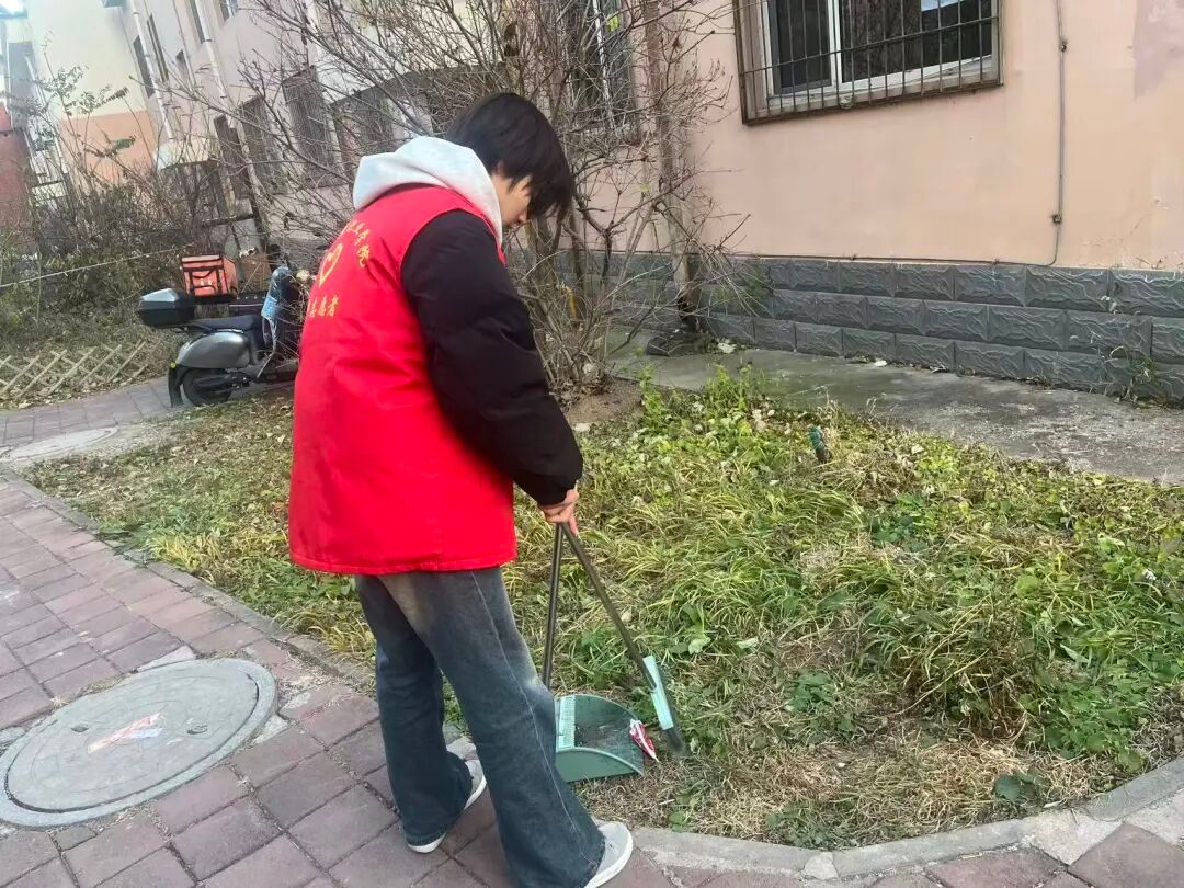 草坪间的枯枝败叶、路面上的落叶碎石、宣传栏旁的卫生死角,都成了志愿者们的“攻坚目标”。大家热情高涨、不怕脏,不怕累,不放过任何卫生盲区,现场呈现一片忙碌有序的劳动景象。