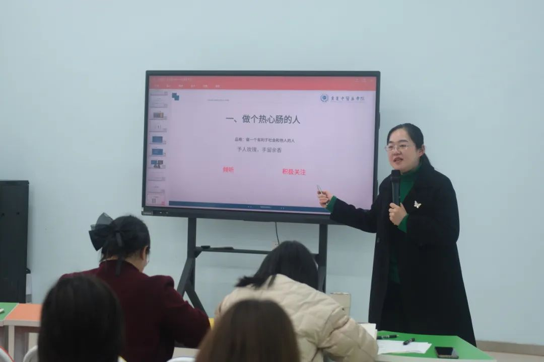 最后,心理健康与咨询中心的王瑜老师围绕“学生心理骨干的基本素养”等内容,主要从学生心理骨干的基本素养、认识心理健康、大学生常见的心理问题、如何当好心理委员四个方面,通过具体的实例引导同学们正确认识心理健康问题,明确心理委员的职责,积极主动地融入到班集体中,与同学们交流谈心,发挥好学院和班级之间的桥梁纽带作用,推动校园良好心理健康氛围的建设。