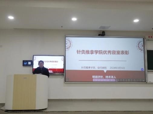 大会第二项“针灸推拿学院优秀寝室表彰”。学院根据寝室成员的综合表现评选出“学风优秀寝室”和“卫生模范寝室”,并由唐成林院长和李学智副院长亲自颁奖,针灸推拿学专业五班李孟坤同学作为优秀寝室代表,分享了如何共同建设学风优良、团结友爱的生活环境的经验。