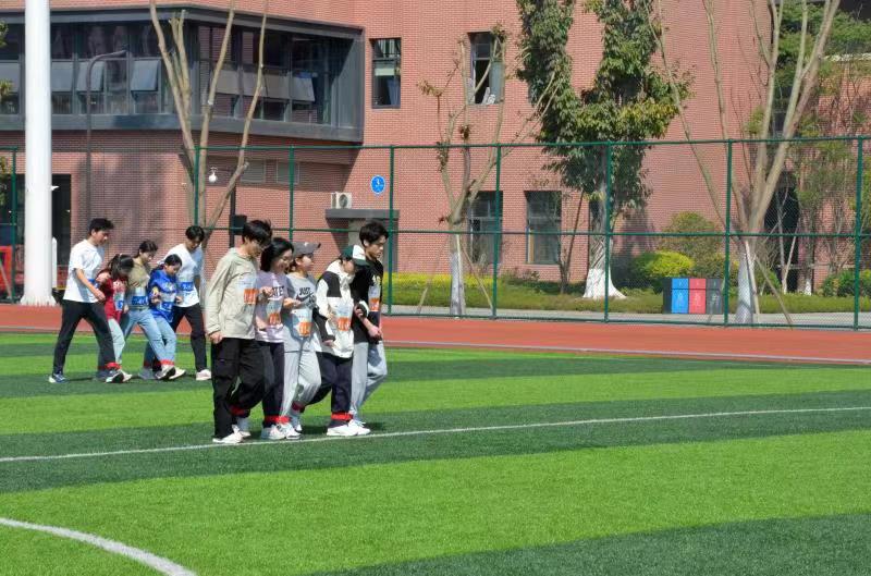 正式比赛开始,首先为热身游戏—五人六足,赛道总长度200米,各组队员默契配合,口号整齐,步伐一致。