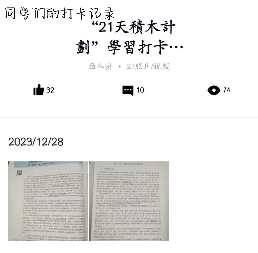 为营造更加良好的学风,学习部于2024年12月11日推出了taptap点点21天积木计划。该计划旨在通过科学的行为养成规律,助力同学们养成良好的学习习惯。同学们积极参与,在社交平台分享自己的学习笔记和心得,展现了新时代医学生的风采。