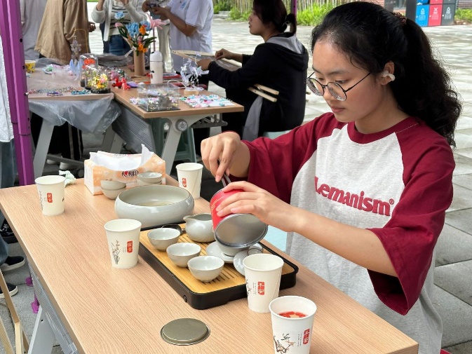 春风向暖,风拂茶叶,茗香沐语茶社成员们布置好现场,泡好茶叶,让师生们感受喝茶带来的内心平静。同时社员们还热情地为前来品茶的同学们普及茶文化,展示茶艺。