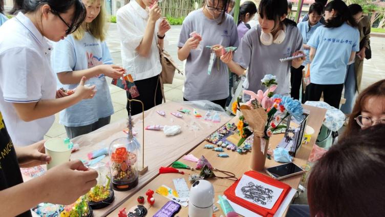 司巧手工社展示了许多中国传统手工,如中药香囊、剪纸、漆扇等。同学们对这些独具中国特色的产品表现出浓厚兴趣。除手工作品展示,司巧手工社还准备了奶油胶和发卡供大家创作,制作成品精美细致。