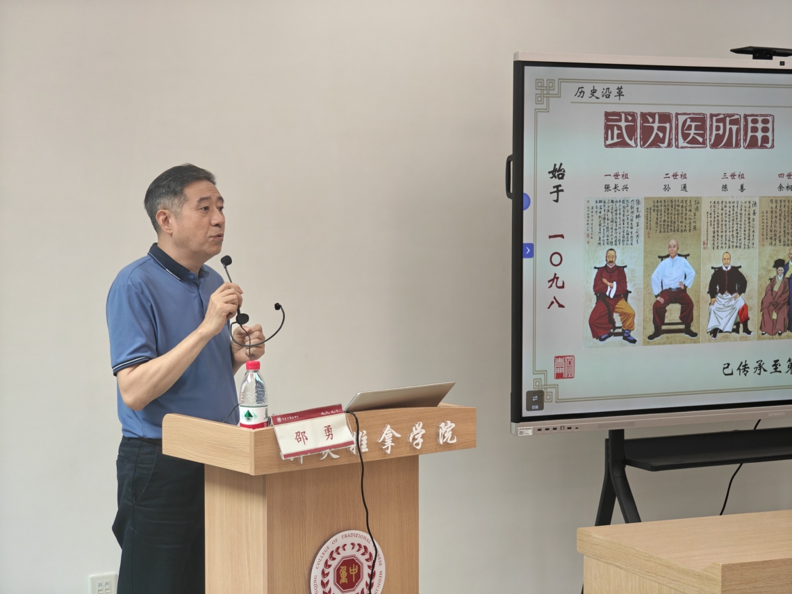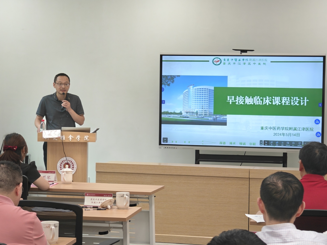 第二阶段,早临床课程方案研讨会,首先由教务处黄思琴副处长致辞,强调了学校对早临床课程的重视和医院实践教学的重要性及本次会议召开的必要性;针灸推拿学院教学秘书陈玥澔老师介绍了针灸推拿学院情况及大一两学期针灸推拿专业和中医骨伤专业早临床课程设置的相关情况,总结了目前早临床课程的经验与问题。随后,附属江津医院何伟副院长分享了江津中医院在针灸推拿学专业早临床组织实施及教学管理的情况,强调了由于个别带教老师因为违背教学纪律受到处理的严格规范教学管理的案例及由医院设立教学案例库激励机制的情况。重庆正刚中医骨科医院邵勇副院长,分别介绍医院人才培养时强调医院“燕青门正骨派”第八代掌门人朱怀宇培养出政府特殊津贴专家1人,重庆英才2人,全国技术能手1人,最美巴渝工匠1人,重庆五一劳动奖章2人,中国保健按摩大师1人,全国十佳保健按摩师2人,十佳健康行业标兵1人,重庆市中帼建功标兵1人,全国商业服务业技术能手1人,国家武术裁判员2人,全国武术比赛三等奖2人,非遗代表性传承人 33人等成绩斐然,并将这些人才培养的经验和做法也应用于学院本科人才培养上,在关心关爱学生方面,播放了学生在自媒体和微信QQ群里对于医院及朱怀宇院长的赞美画面。同时也分享了2023-2024学年早临床带教和《中医学术流派与特色疗法讲座》的相关情况及课程特色情况。