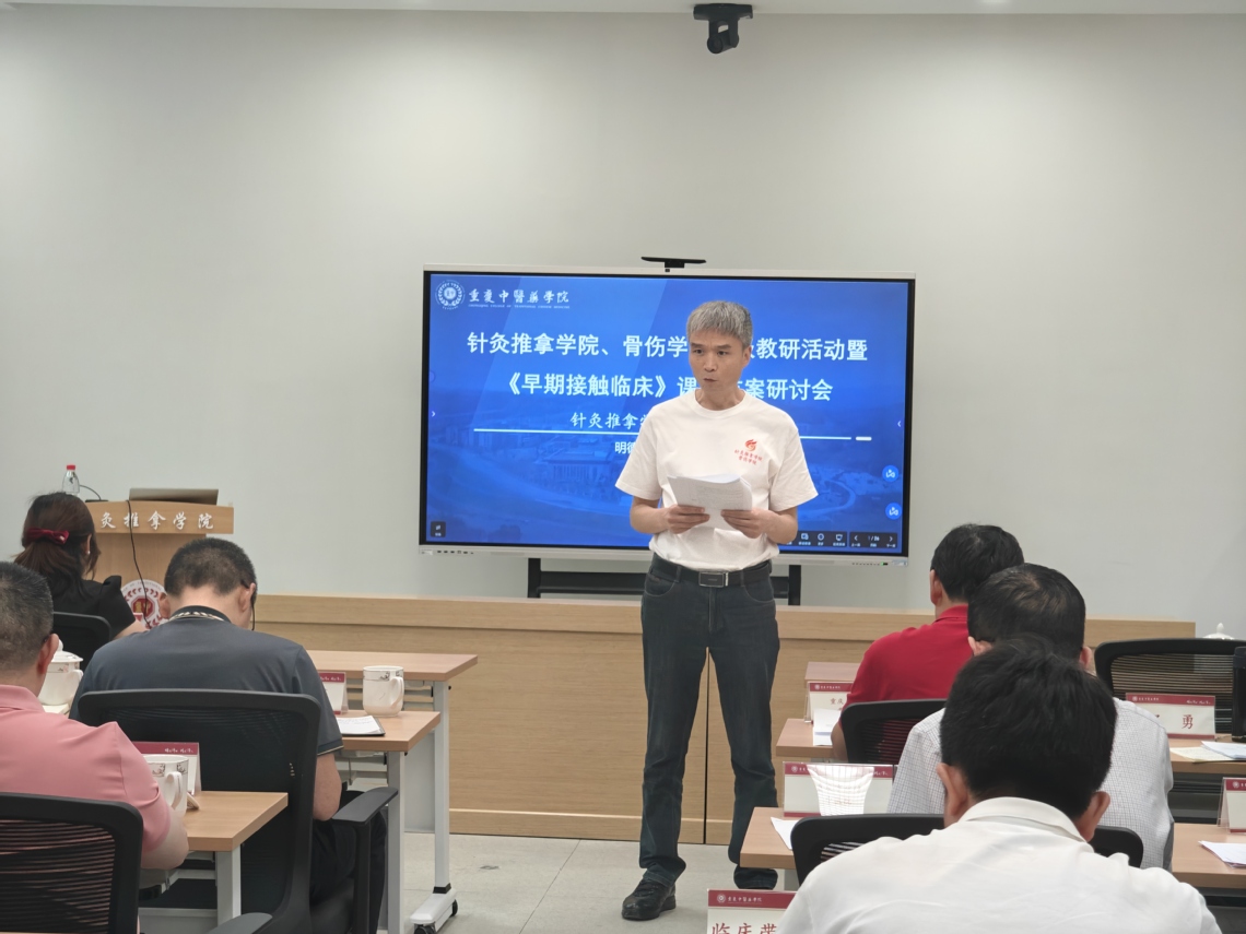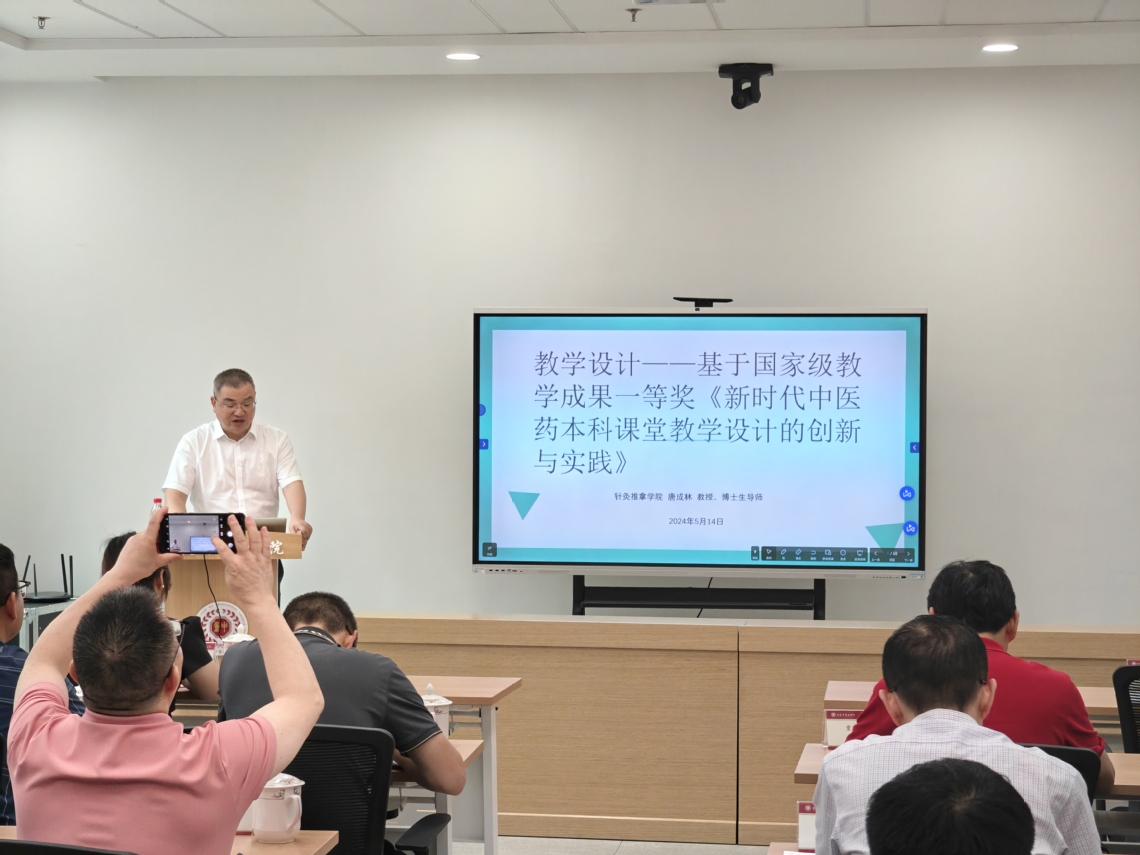 第一阶段,针灸推拿学院、骨伤学院院级教研活动,唐成林教授作为主讲人,以 “教学设计—— 基于国家级教学成果一等奖《新时代中医药本科课堂教学设计的创新与实践》”为题,结合早临床的课程实际,分享了教学设计和教学方面的经验。