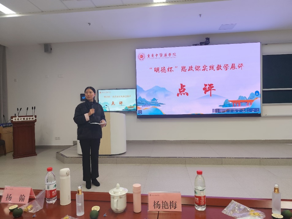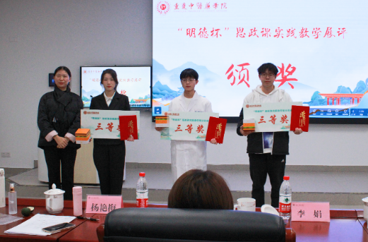 为深入贯彻习近平总书记对学校思政课建设作出的重要指示精神,推动思政课程内涵式发展,12月11日下午,教务处、马克思主义学院在综合教学楼E1-104举办2024-2025学年第一学期“明德杯”思政课实践教学成果展示评比活动。本次活动以“承中医文化 做中医传人”为主题,教务处副处长李娟、马克思主义学院院长代浩云、医药导报主编冯华、学生处事务管理科科长杨翰、中医学院杨艳梅教授和百余名师生代表参加。