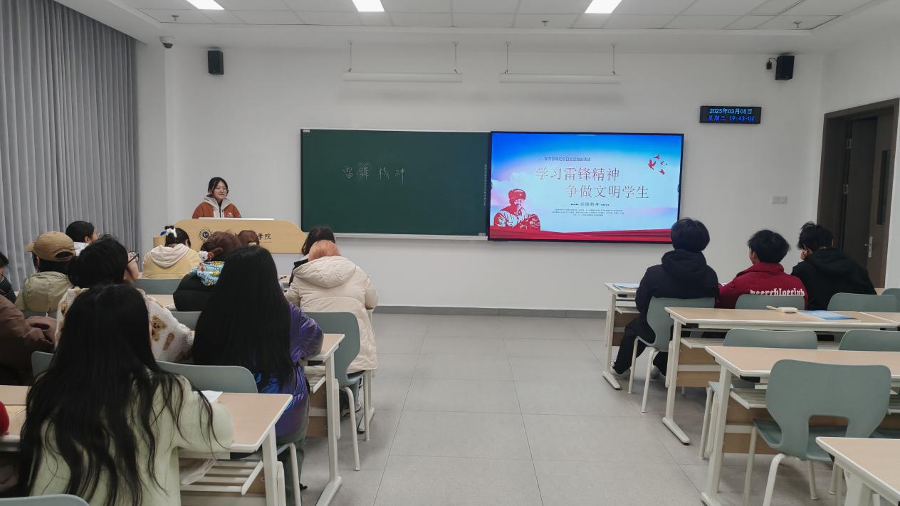 2025年3月5日19:30,通识学院健康服务与管理专业1班在C2-108教室举办学雷锋日主题班会,由组织委员李亚希担任主讲。
