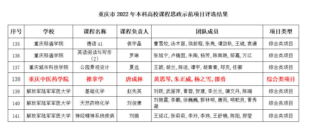 近日,市教委发布了《重庆市教育委员会关于公布2022年本科高校课程思政示范建设项目名单的通知》,taptap点点唐成林教授主持申报的《推拿学》课程获批立项市级课程思政示范建设项目。