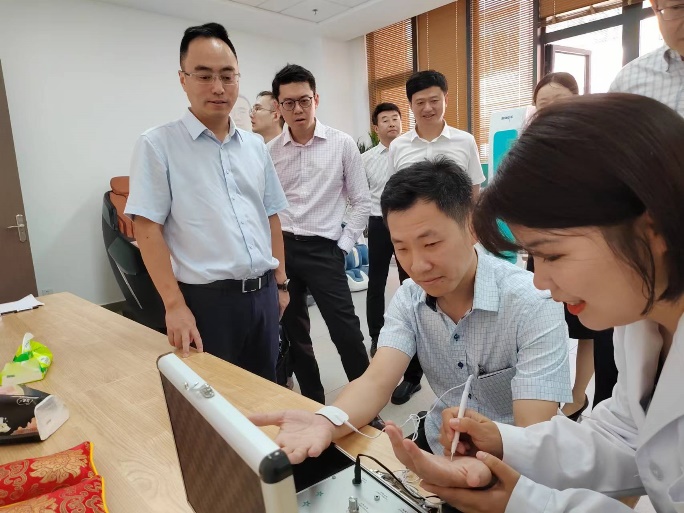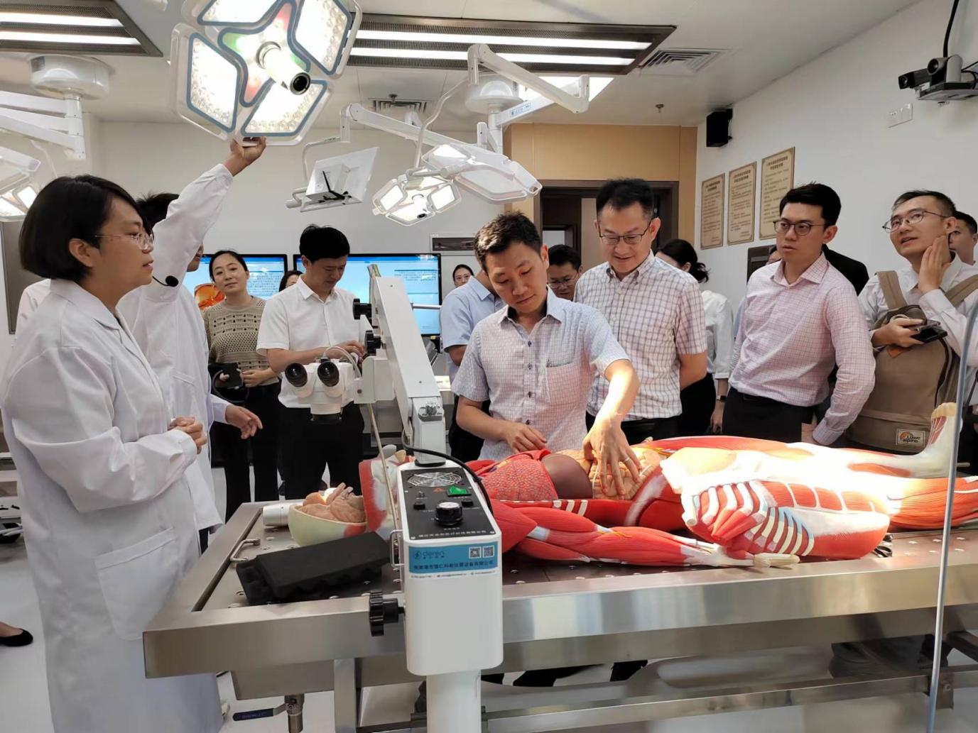 陈知恩一行调研了解了校园建设总规划和学院一期建设情况,并参观了基础医学院、中医学院,体验了舌诊、脉诊等中医特色诊疗技术。