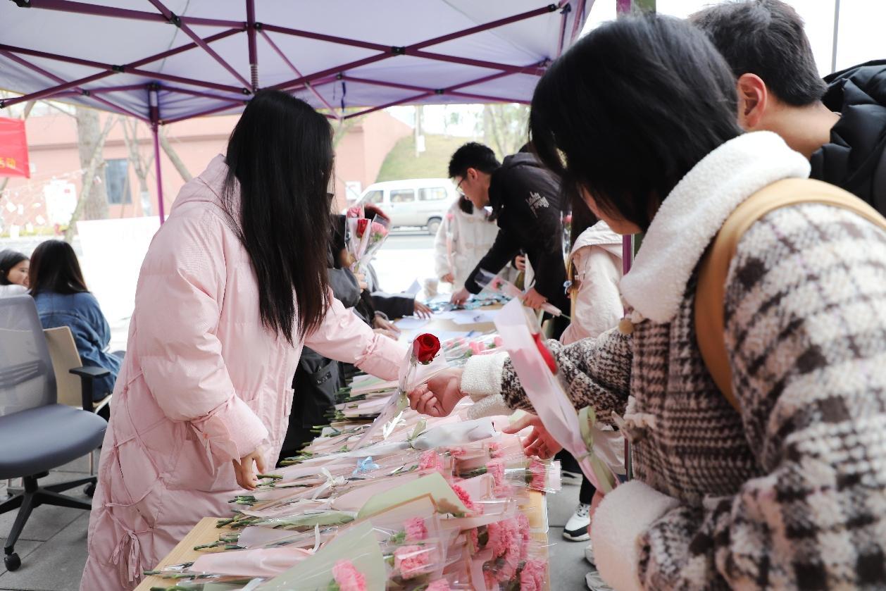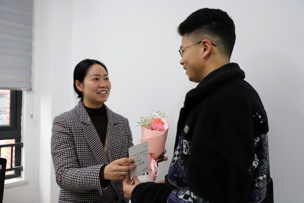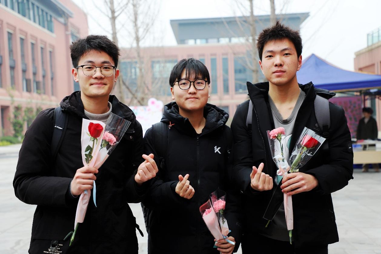 男同学们“突袭”送上节日祝福的鲜花,给女老师们送去了甜蜜的惊喜。