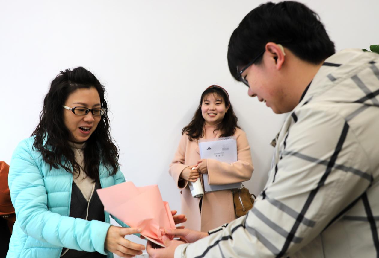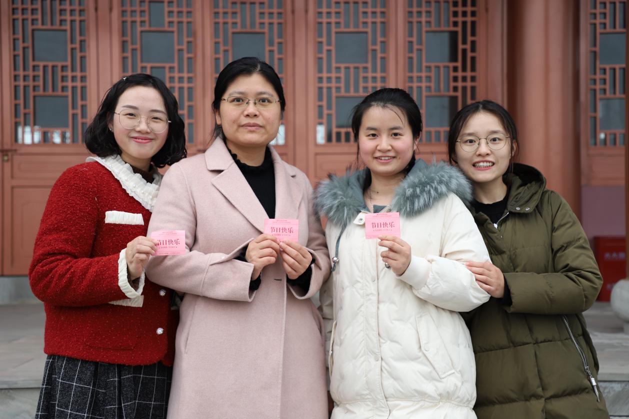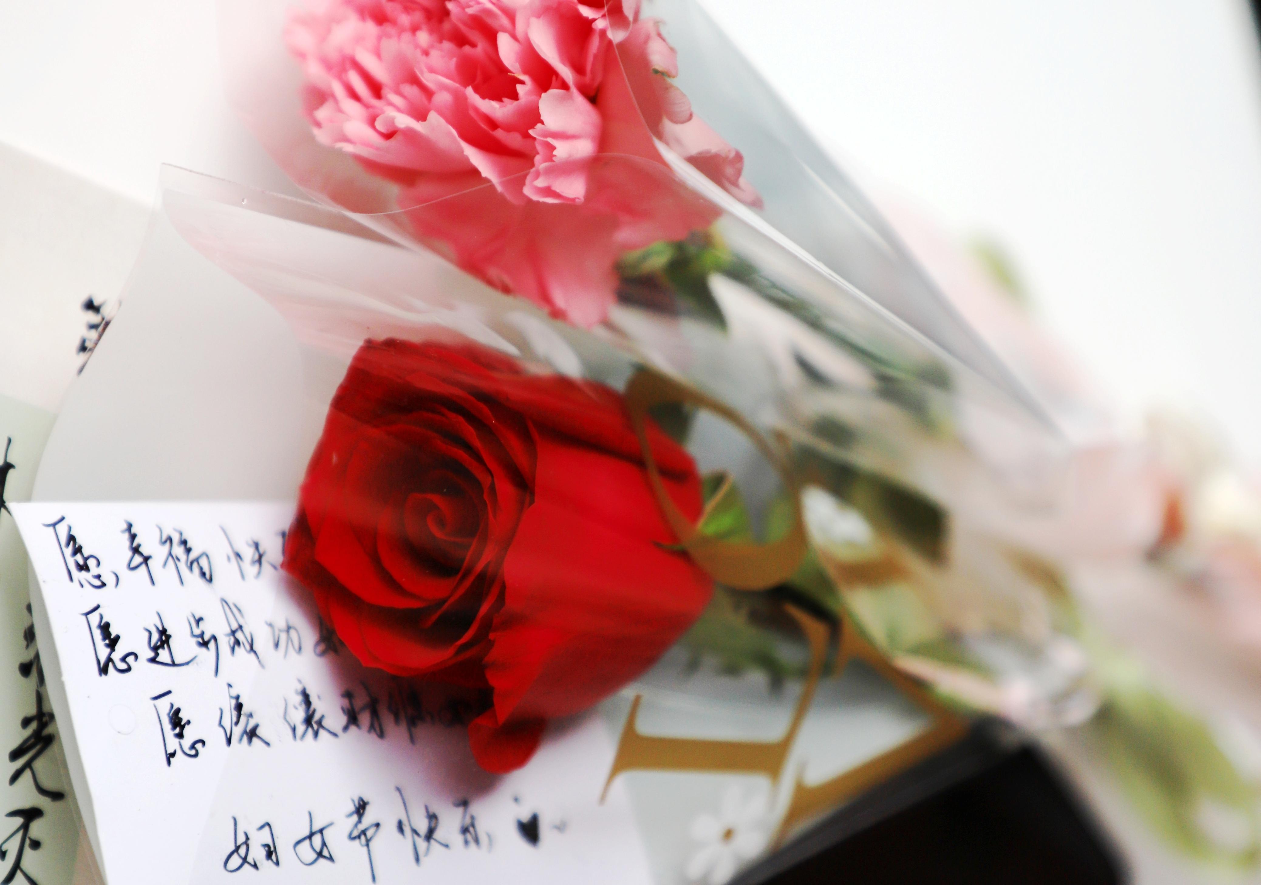 男同学们“突袭”送上节日祝福的鲜花,给女老师们送去了甜蜜的惊喜。