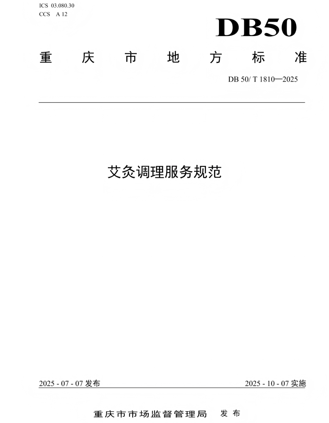 为进一步推动重庆市艾灸行业规范化、专业化发展,由重庆市保健服务行业协会提出,重庆市商务委员会归口的《艾灸调理服务规范》(标准号:DB 50/ T 1810-2025)已于近期由重庆市市场监督管理局正式发布。