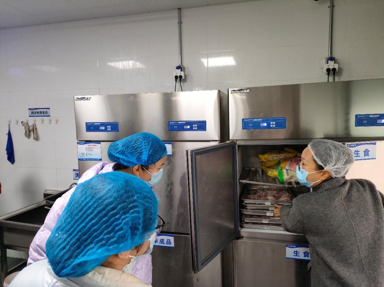 随后,师生代表在食堂负责人的带领下先后参观了南、北区食堂食品原材料库房、原材料验收区、加工清洗区、切配间、烹饪间、售餐间、原材料检测室等多个工作区域,“零”距离地了解了食品从原材料到留样再到出餐的各环节操作规范和流程。