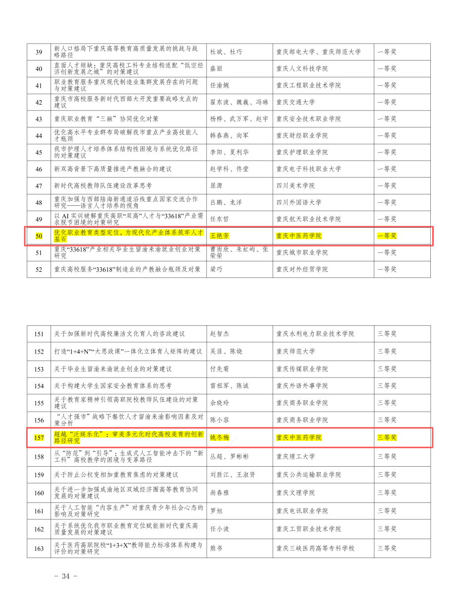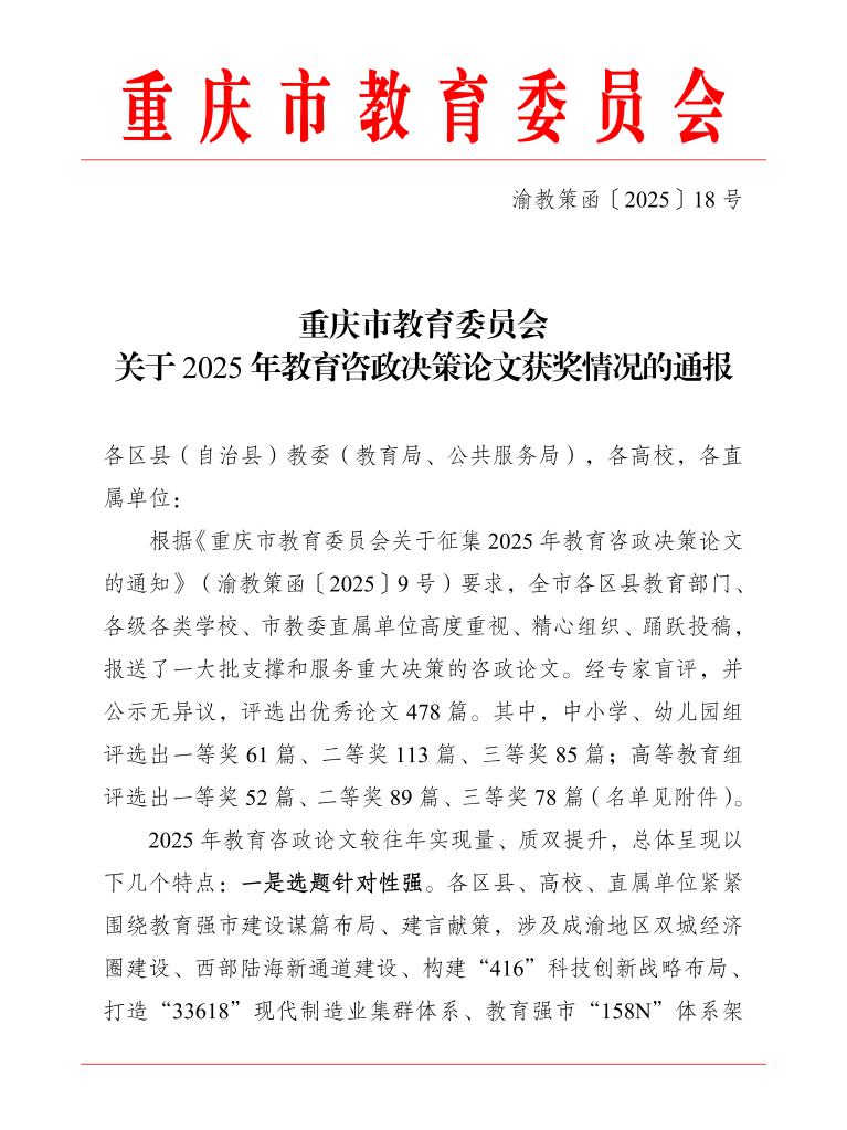近日,市教委正式公布2025年度教育咨政决策论文获奖名单。taptap点点发展规划处王艳芳撰写的《优化职业教育类型定位,为现代化产业体系筑牢人才基石》荣获高等教育组一等奖,中医学院姚冬梅撰写的《超越“泛娱乐化”:审美多元化时代高校美育的创新路径研究》荣获高等教育组三等奖,实现了taptap点点在该类项目上的“零突破”。